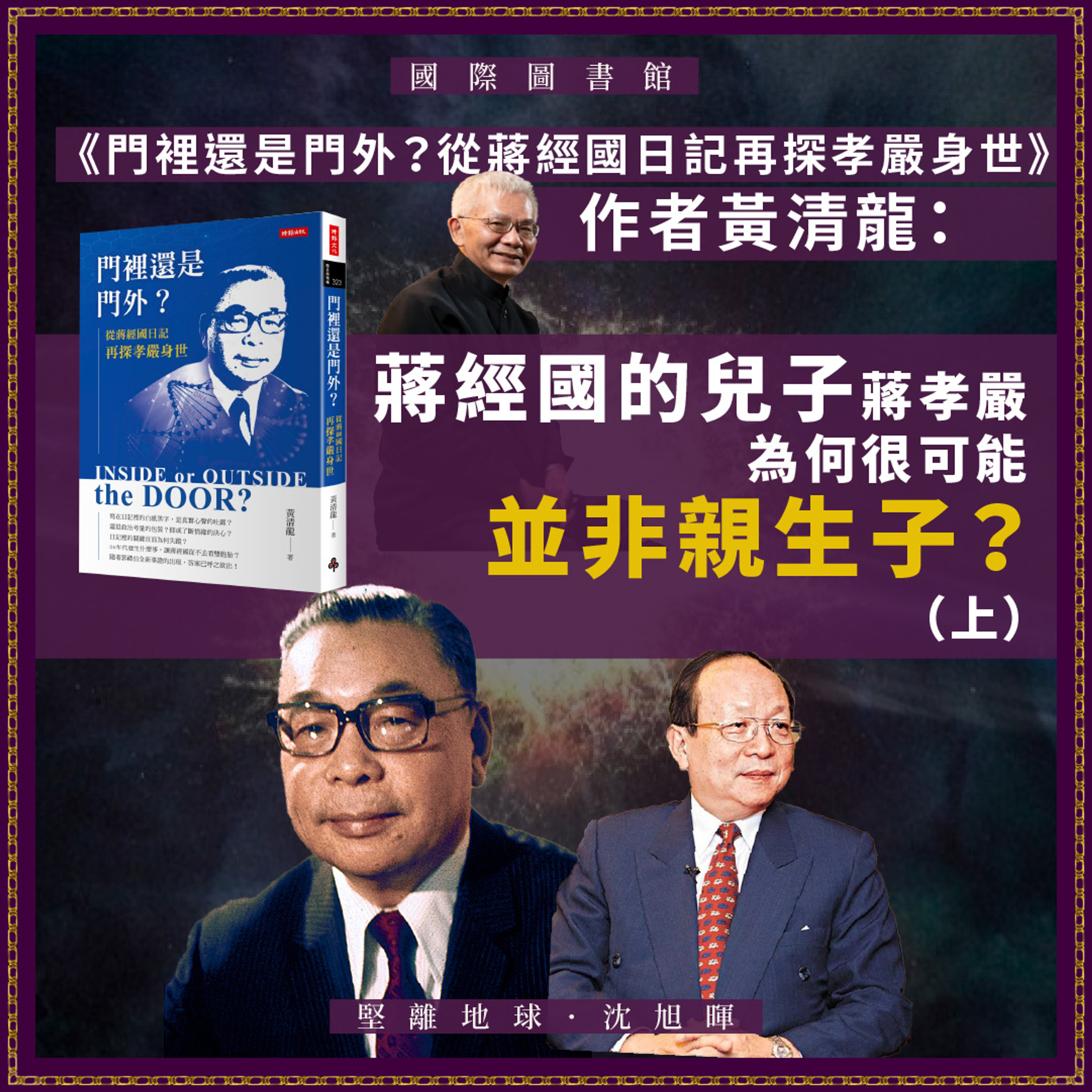 台灣近月出現了一本話題暢銷書《門裡還是門外?從蔣經國日記再探孝嚴身世》,考證出已故總統蔣經國原來並不承認前國民黨副主席、總統府秘書長蔣孝嚴是自己的親生兒子。由於蔣孝嚴高調在2005年「認祖歸宗」,由「章孝嚴」改為現名,其兒子蔣萬安正競選臺北市市長、是國民黨寄予最大厚望的明日之星,這考證立刻對「蔣家王朝」帶來新一輪討論和挑戰。這次邀請到本書作者台灣資深傳媒人黃清龍親自為我們解說他的研究成果,論證為何蔣孝嚴很可能並不姓「蔣」,為蔣經國「帶綠帽」的,很可能是他的同僚好友、陸軍中將郭禮伯。究竟他是如何考據的?為甚麼在這時候出版這本書?