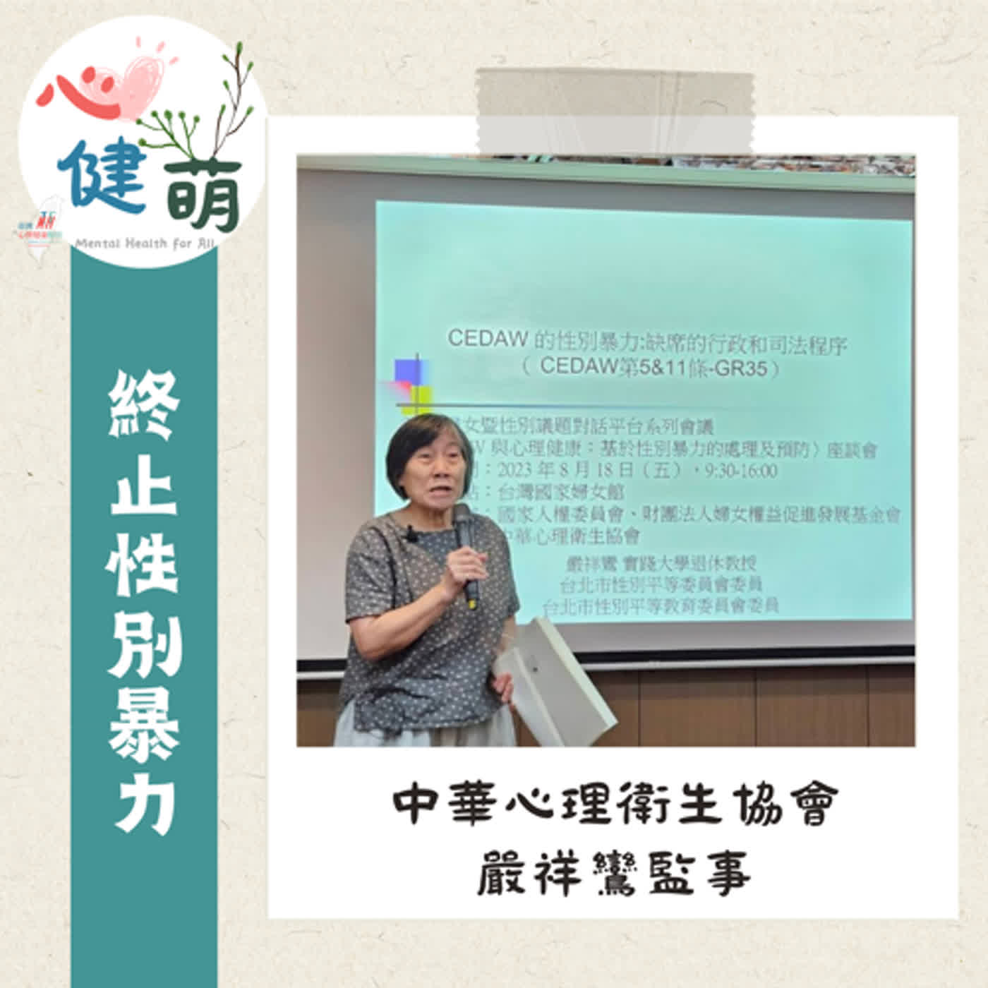 中華心理衛生協會嚴祥鸞監事,從 消除對婦女一切形式歧視公約(CEDAW)出發,用豐富的故事串連,讓我們深刻感受台灣在行政及司法層面,在消除性別暴力上還需付出更多努力。