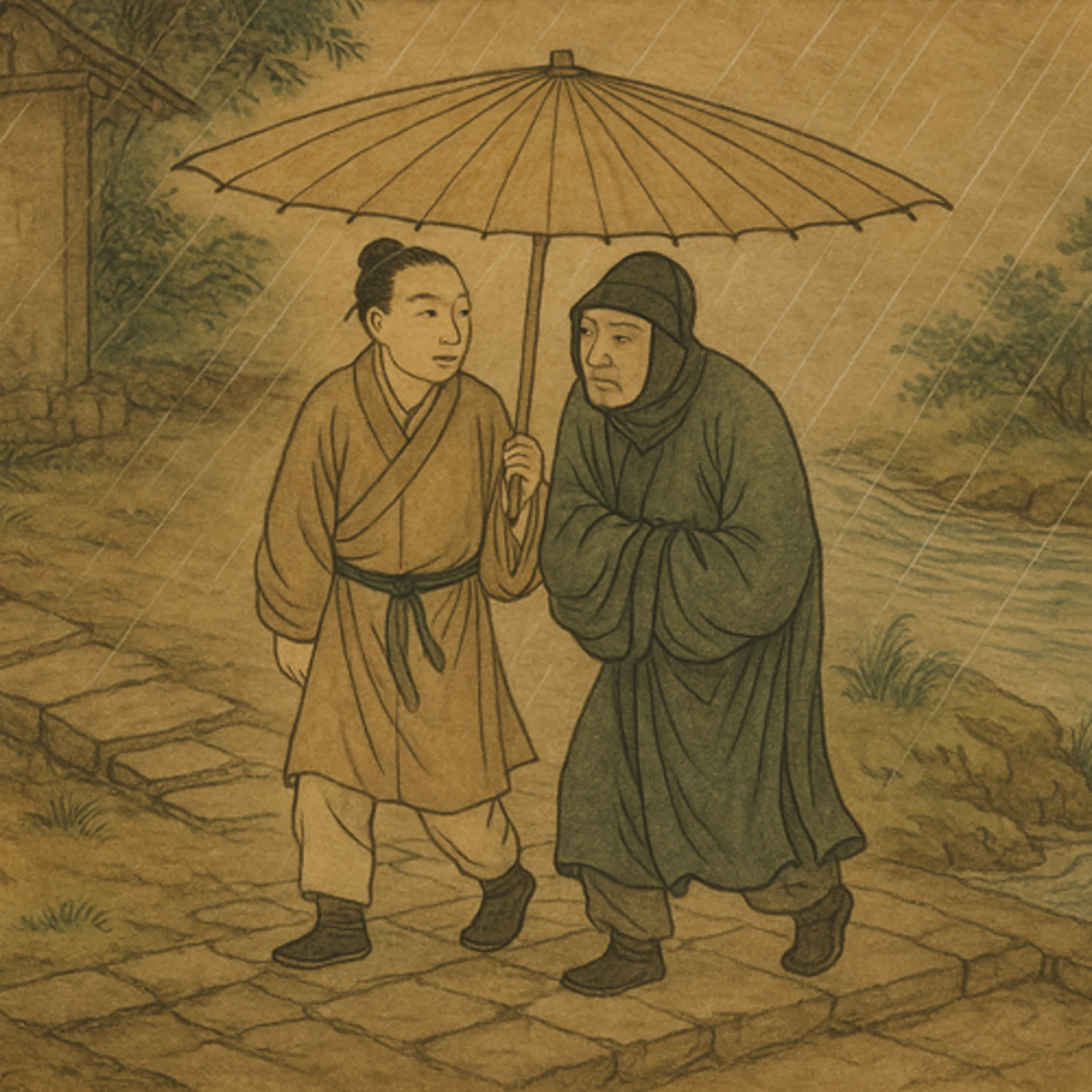 有赴飲夜歸者,值大雨,持蓋自蔽,見一人立檐下溜,即投傘下同行。久之,不語,疑為鬼也,以足撩之,偶不相值,愈益恐,因奮力擠之橋下而趨。值炊糕者晨起,亟奔入其門,告以遇鬼。俄頃,復見一人,遍體沾濕,踉蹌而至,號呼有鬼,亦投其家。二人相視愕然,不覺大笑。 ──續笑林廣記