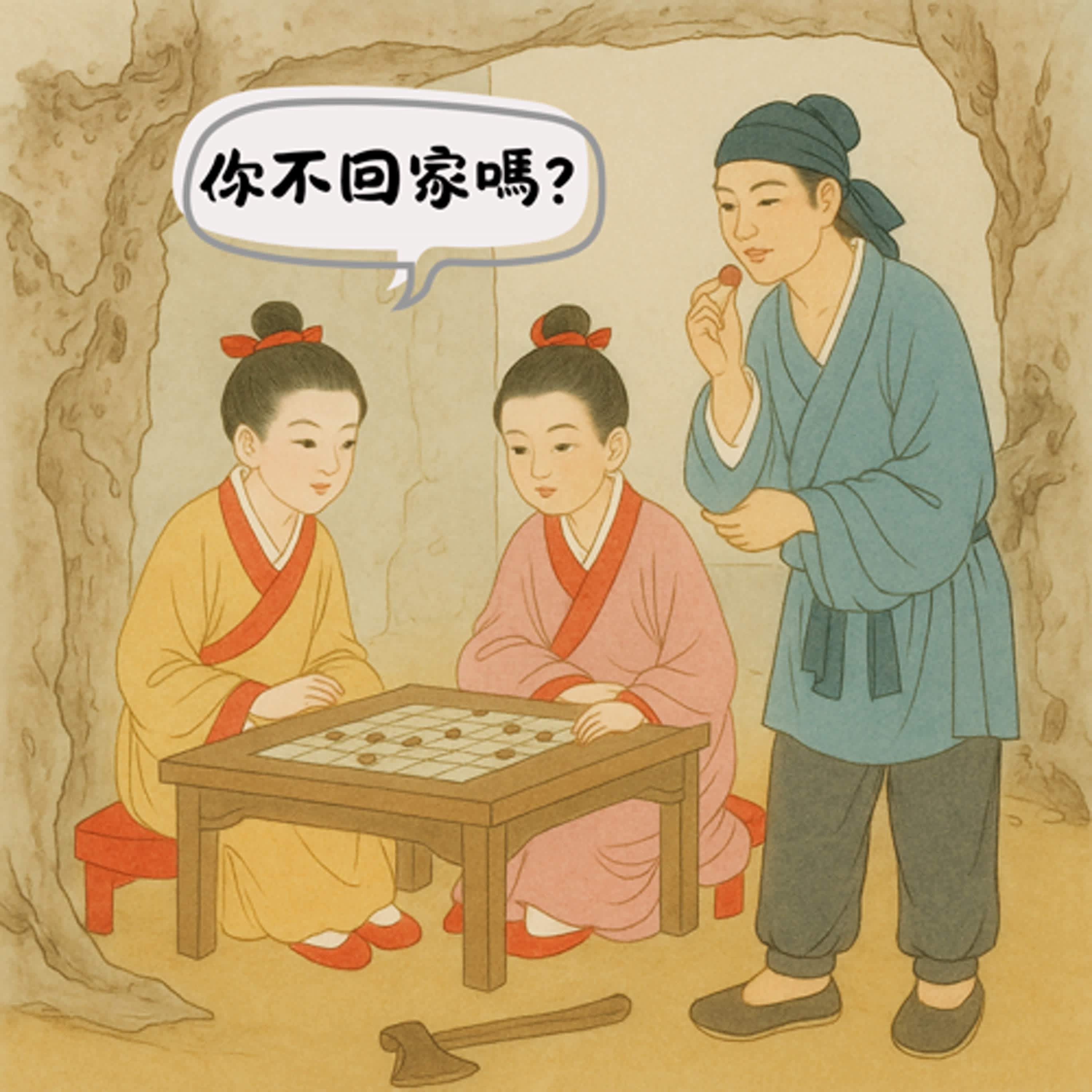 信安郡石室山,晉時王質伐木至,見童子數人棋而歌,質因聽之。童子以一物與質,如棗核,質含之而不覺飢。俄頃,童子謂曰:「何不去?」質起視,斧柯盡爛,既歸,無復時人。