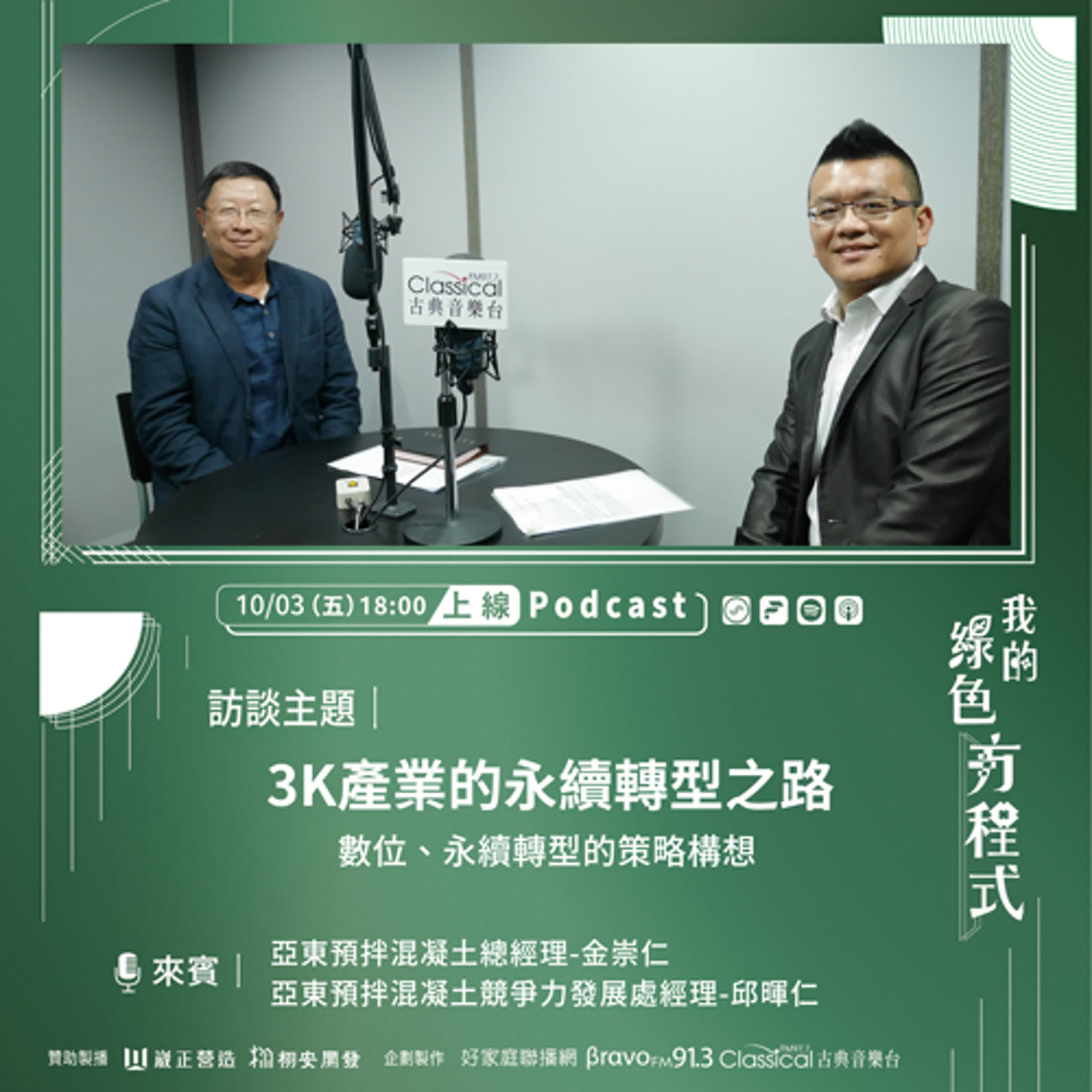 本集《我的綠色方程式》,邀請亞東預拌混凝土的總經理-金崇仁、以及競爭力發展處經理邱暉仁,如何利用AI科技和自動化流程,管理碳排、碳足跡,讓混凝土產業由內而外「綠」起來!