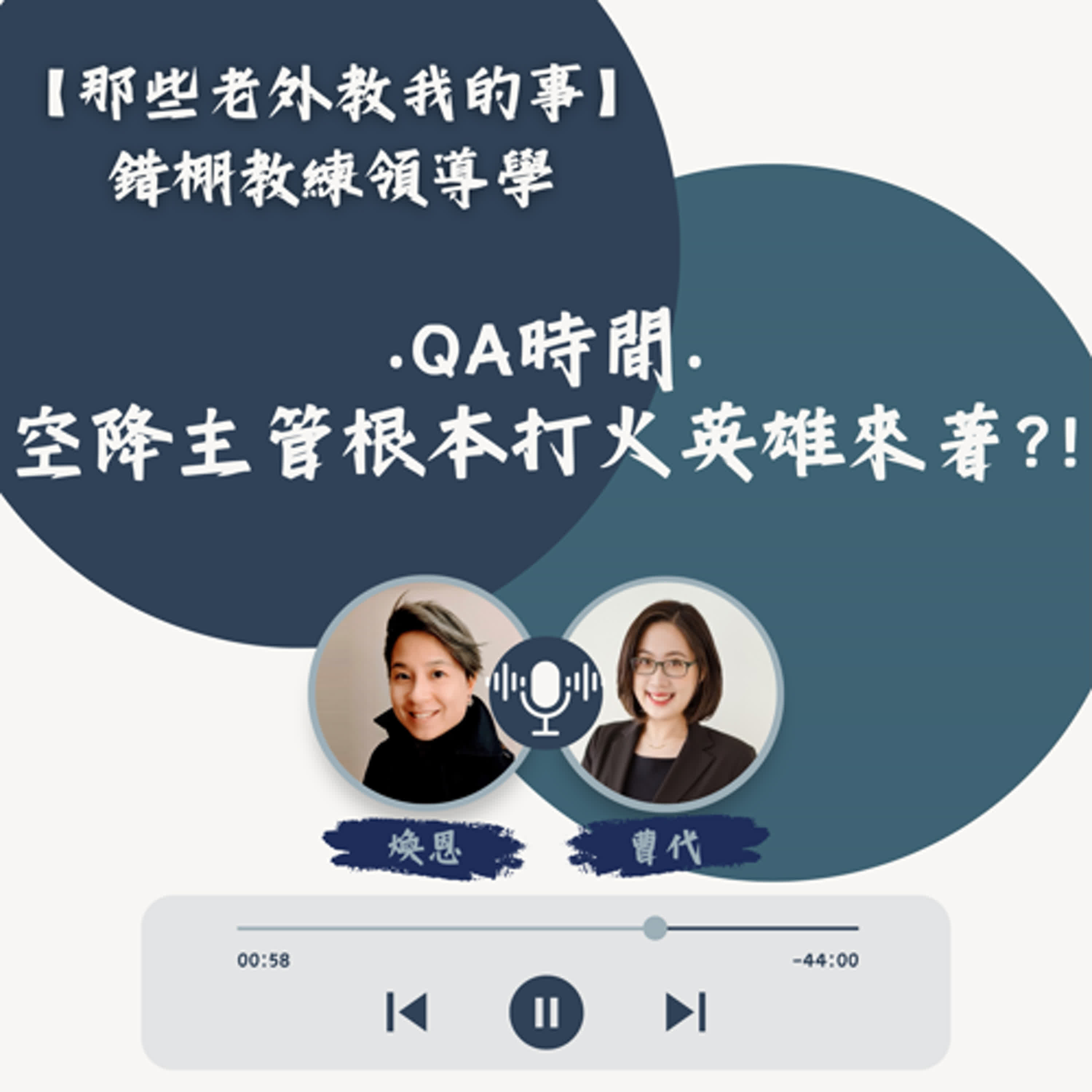職場特別系列《錯棚教練領導學》快要變成煥恩的個人職涯諮商室!過去半年跟大家聊電視影集《Ted Lasso》,提到劇中不少角色都被賦予空降主管的重責大任,進入全新環境時,有各種不同的方式在最短時間建構團隊。本週在節目中跟大家聊空降主管面對哪些艱鉅挑戰?又為何聆聽往往是領導者最強大的超能力?空降主管和廚藝實境秀為什麼能扯上邊?