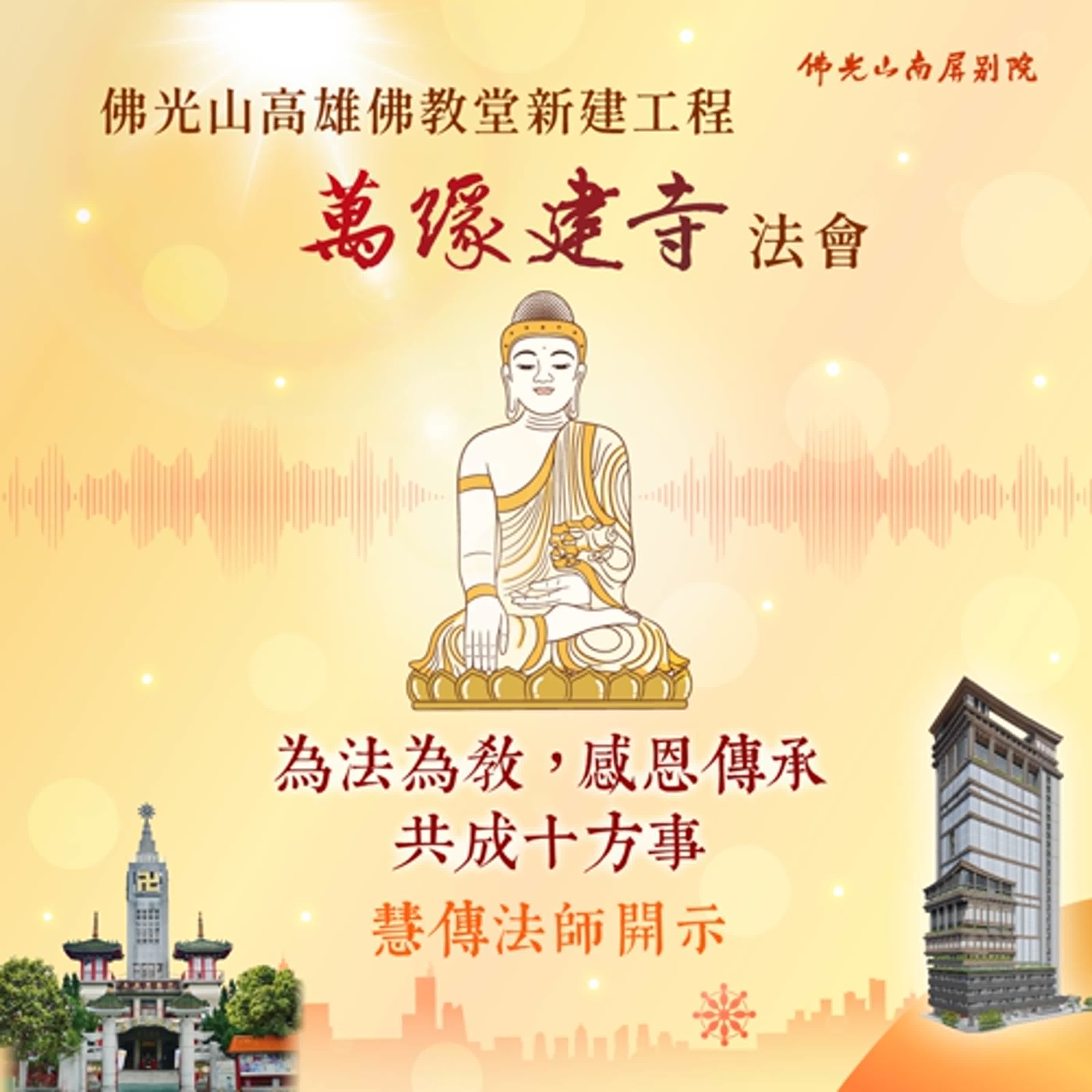 一直到 2004 年,佛教堂的人還在紛爭不已。好不容易有幾位比較有正知正見的人來到山上。師父說:「我們就把它接下來。」師父為什麼要來蓋佛教堂,因為欠高雄一個恩情,佛教堂當初是市政府給我們去建設的,所以我們有責任要把佛教堂蓋起來,讓它發揚光大。取之於社會,用之於社會。我們要好好的傳承師父這種感恩的精神、為法為教的精神,大家一起來共成十方的事業,一起來護持,謝謝。
