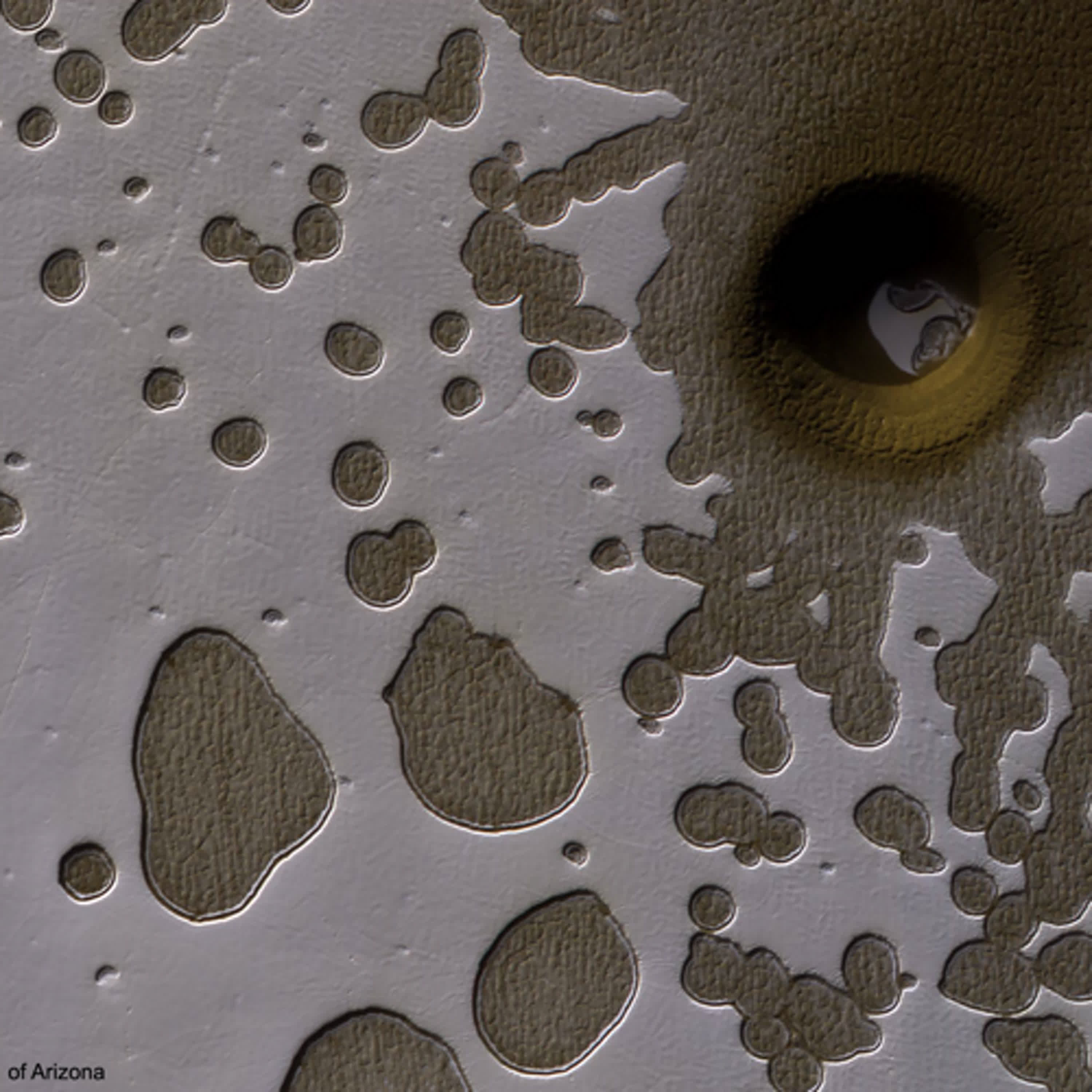 是啥物造成火星頂懸出現這个無四常 ê 窟仔?這張地形圖內底一空一空,四界攏是,就親像是瑞士 chhì-suh 仝款。等較淺色 ê 二酸化炭素冰層蒸發了後,下底出現 ê 空,大部份攏是暗色、厚塗粉 ê 火星地表。毋過正爿頂懸這个較特別,伊差不多有 100 公尺闊,看起來親像欲迵對地下層去。這个窟仔是按怎會 tī 遮,伊 ê 邊仔是按怎會箍一輾隕石坑結構,到今猶毋知。有一个主要 ê 假設是講,伊是去予太空石頭舂--ê。逐家會對這款窟仔有興趣,是因為 in 可能是迵對地下層 ê 入口,下底可能有地下洞穴。若是按呢,這寡自然形成 ê 地下磅空,就袂受著火星地表氣候 ê 影響。相對來講,會是較適合火星性命生存 ê 所在。所以,這款窟仔嘛是未來太空船、機器人,抑是人類星際探險家 主要欲揣 ê 目標。
