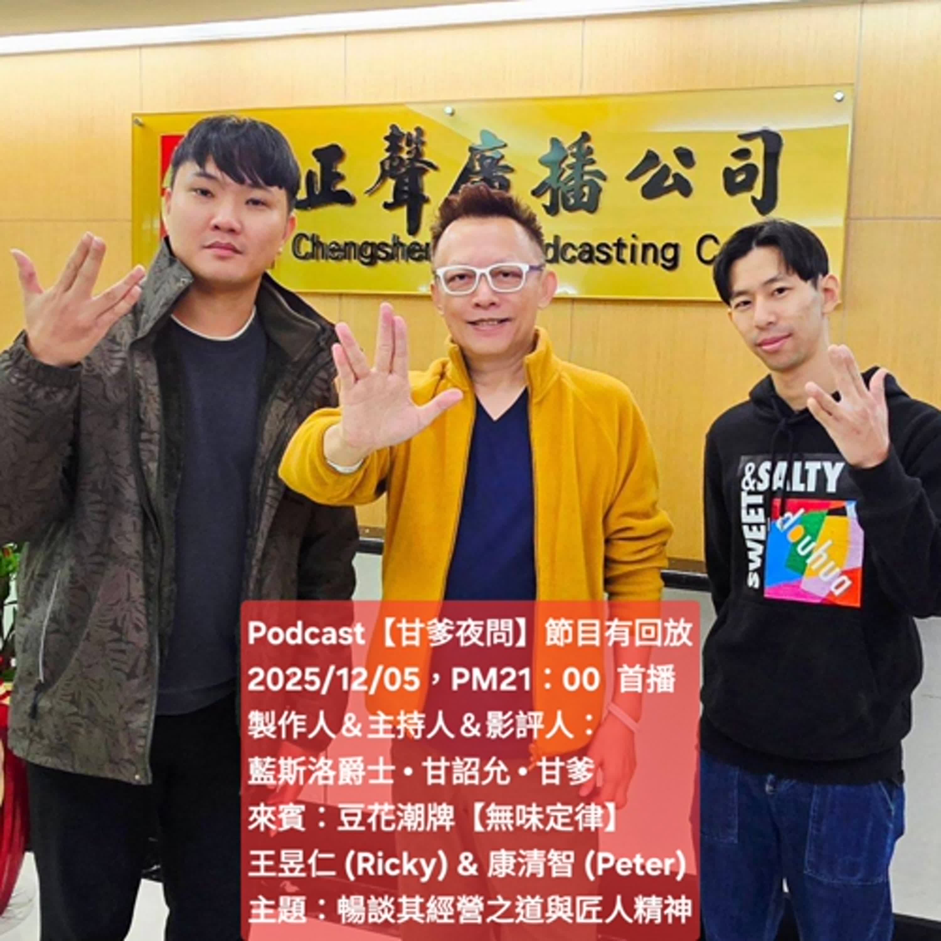 ❤️ 今天我們現場,很開心能邀請到最近很紅、很火的豆花潮牌【無味定律】的兩位少年董A,王昱仁 (Ricky) 與 康清智(Peter) 來上我們的【甘爹夜問】節目,跟我們聊聊「豆花潮牌」【無味定律】的「經營之道」與「匠人精神」。