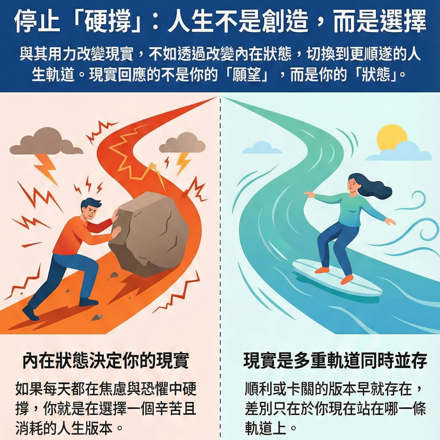 在現今的社會氛圍中,我們似乎陷入了一種集體的過度勞累。許多人並非是在「過生活」,而是在「用力撐生活」。我們慣於告訴自己要再努力一點、再堅持一下,試圖憑藉意志力去硬生生地改變現實。然而,這種長期的「硬撐模式」往往伴隨著巨大的心理阻力。當你發現自己越是掙扎,現實卻越是凝重時,或許該停下來思考:這種疲勞感是否源於我們對現實運作機制的誤解?留言告訴我你對這一集的想法: 📺 影片版:https://youtu.be/2jmoT8njf68