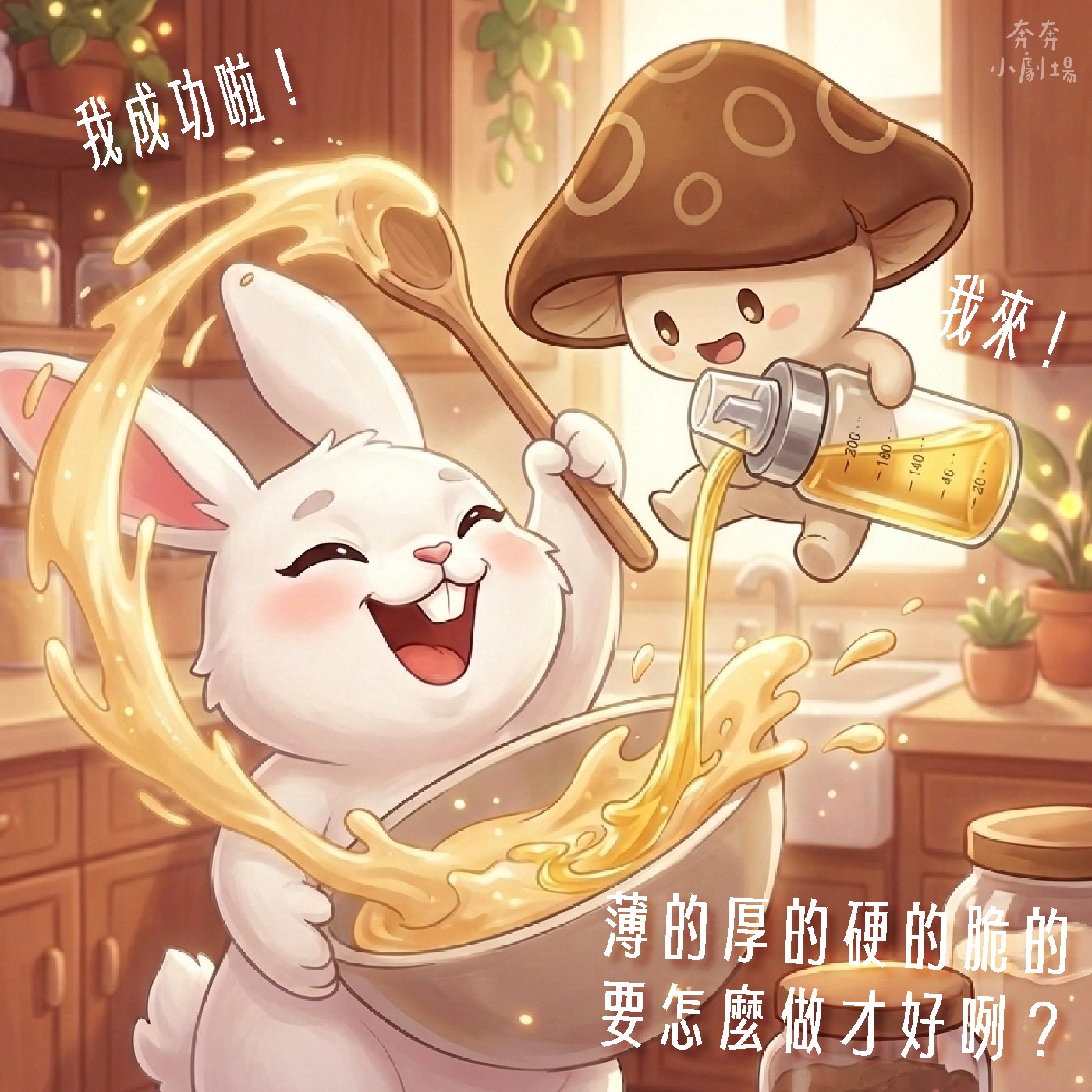 冰燄山上的一座石屋裡,雪藏兔正忙匆匆地製作麵糊,下鍋拭餅,被燙得連連後退。