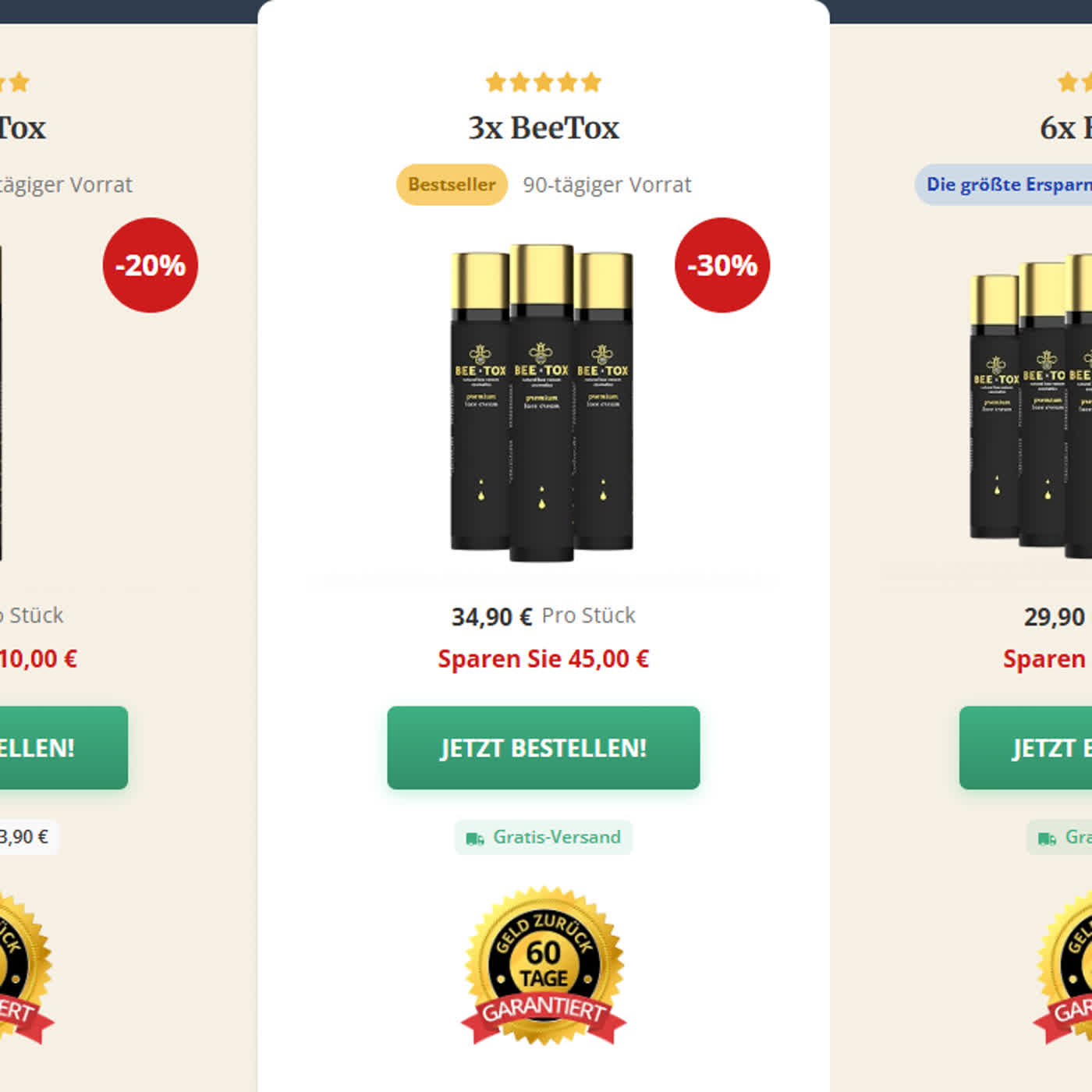 Besonders beruhigend fand ich die Garantie. Auf der offiziellen BeeTox-Website gibt es regelmäßig Angebote, bei denen Sie durch den Kauf einer 3- oder 6-Monats-Packung deutlich sparen können. Außerdem bietet BeeTox eine Zufriedenheitsgarantie, was in der Hautpflegebranche selten ist.