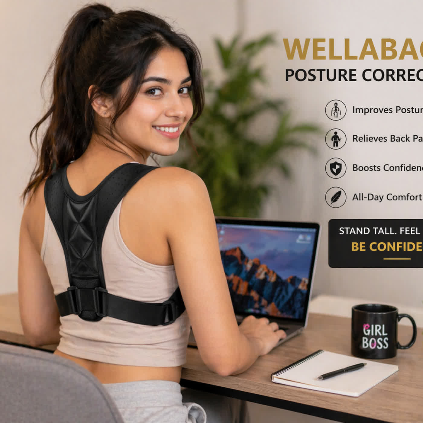 The WellaBack Posture Corrector is a lightweight, adjustable wearable support designed to gently align your shoulders and spine into a natural upright position. Unlike rigid braces that can feel uncomfortable, this device focuses on gentle correction and muscle training, helping your body relearn proper posture over time.